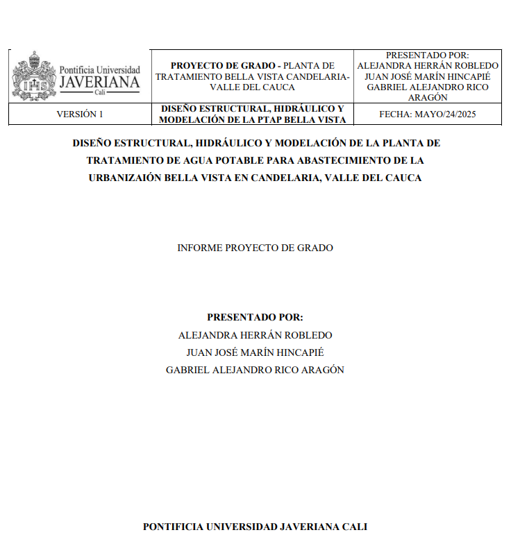 Item Planta de tratamiento de agua potable para abastecimiento de la urbanización Bella Vista en Candelaria, Valle del Cauca(Pontificia Universidad Javeriana Cali, 2025) Herrán Robledo, Alejandra; Rico Aragón, Gabriel Alejandro; Marín Hincapié, Juan José; Cundumí Sánchez, Orlando; Martínez Echeverry, José JavierEl presente informe técnico tiene como objetivo diseñar una Planta de Tratamiento de Agua Potable (PTAP) que garantice el suministro continuo, eficiente y autónomo de agua potable para una nueva urbanización mixta (residencial y comercial) ubicada en el municipio de Candelaria, Valle del Cauca. Esta urbanización no cuenta actualmente con conexión a una red pública de acueducto, por lo que se requiere una solución integral que cumpla con la normativa nacional vigente, especialmente el Reglamento Técnico del Sector de Agua Potable y Saneamiento Básico – RAS 2020, y la Norma Sismo Resistente Colombiana – NSR-10. La planta fue diseñada para atender una población proyectada de 1.415 habitantes, con una dotación de 130 litros por habitante al día. El sistema propuesto incluye las siguientes unidades: una bocatoma de fondo ubicada sobre el río Quilichao, una línea de aducción, un desarenador, un sistema de filtración en múltiples etapas (FiME), un tanque de almacenamiento enterrado y una red de distribución. Cada unidad fue desarrollada con criterios técnicos y ambientales, teniendo en cuenta la topografía, calidad del agua cruda, condiciones del suelo y demandas futuras. El sistema de filtración FiME se compone de tres etapas: filtración gruesa dinámica (FGDi), filtración gruesa ascendente en capas (FGAC) y filtración lenta en arena (FLA). Estas tecnologías fueron seleccionadas por su eficiencia en la remoción de turbidez y coliformes, así como por su sostenibilidad y bajo requerimiento en insumos químicos. Además, el diseño estructural de las unidades fue realizado en concreto reforzado, con análisis detallados de cargas muertas, vivas, sísmicas e hidrodinámicas, modelados mediante software como SAP2000 y AutoCAD Civil 3D.