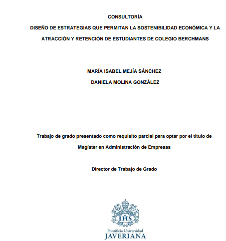 Item Consultoría diseño de estrategias que permitan la sostenibilidad económica y la atracción y retención de estudiantes de Colegio Berchmans(Pontificia Universidad Javeriana Cali, 2022) Mejía Sánchez, María Isabel; Molina González, Daniela; García Pinzón, Luis HernandoEl Colegio Berchmans de Cali, fundado por la Compañía de Jesús hace 89 años, se ha consolidado como una institución educativa reconocida por su excelencia académica, formación en valores y enfoque integral. Sin embargo, en los últimos años ha enfrentado una disminución significativa en su matrícula estudiantil, con una pérdida de alumnos. Ante esta situación, el presente estudio propone diseñar estrategias que fortalezcan la sostenibilidad económica del colegio y mejoren la atracción y retención de estudiantes. A través de un enfoque mixto, combinando métodos cuantitativos y cualitativos, se analizarán indicadores institucionales, del entorno y de la competencia, con el fin de identificar las causas de la deserción y proponer acciones efectivas que aseguren la permanencia del Colegio Berchmans como una opción educativa de alta calidad.
